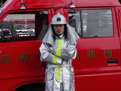 火災現場で着用します。火にまかれても大丈夫!!